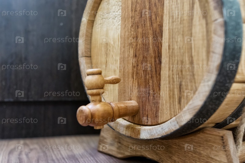 Небольшая деревянная дубовая бочка для домашнего производства и стопка выдержанного в ней виски