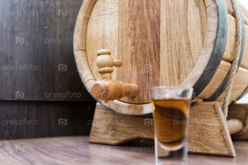 Небольшая деревянная дубовая бочка для домашнего производства и стопка выдержанного в ней виски