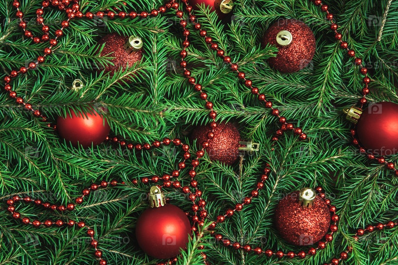 Фоновая текстура ветвей елки с красными безделушками и бисером