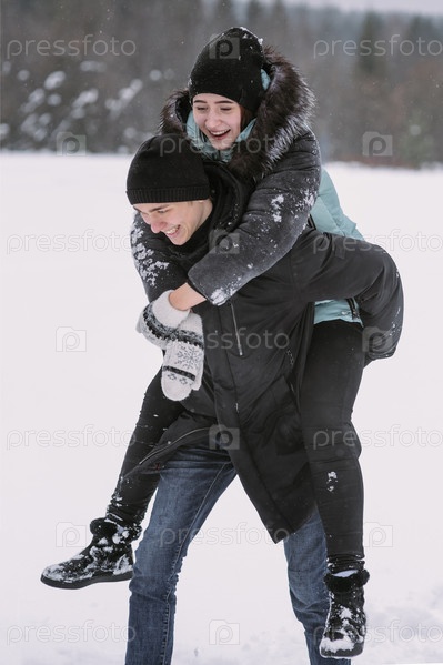 Счастливая пара подростков, весело играющих в снегу в зимнем лесу