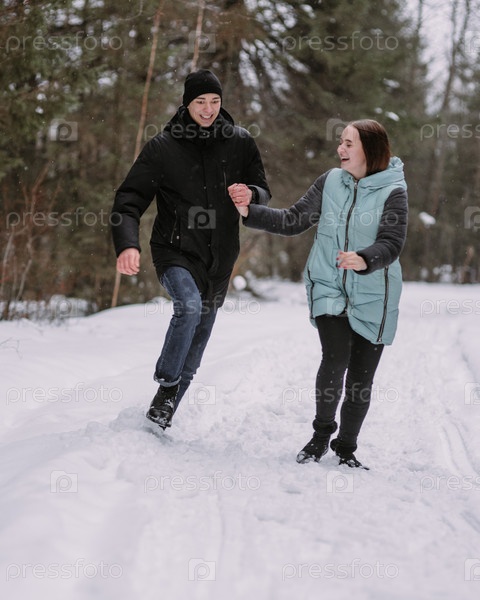 Влюбленная пара подростков, гуляющих зимой