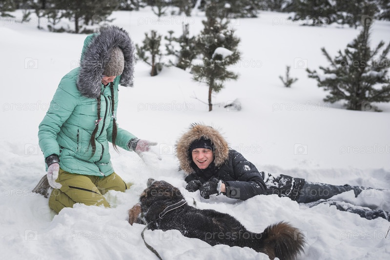 Счастливая молодая пара гуляет с собакой в зимнем лесу