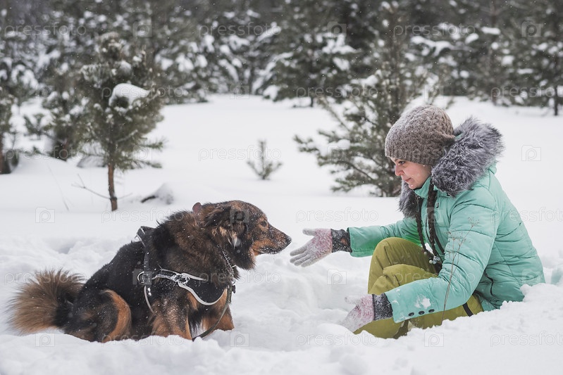 Женщина веселится с собакой на снегу в зимнем лесу