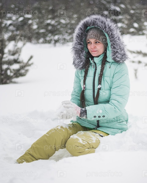Женщина веселится с собакой на снегу в зимнем лесу