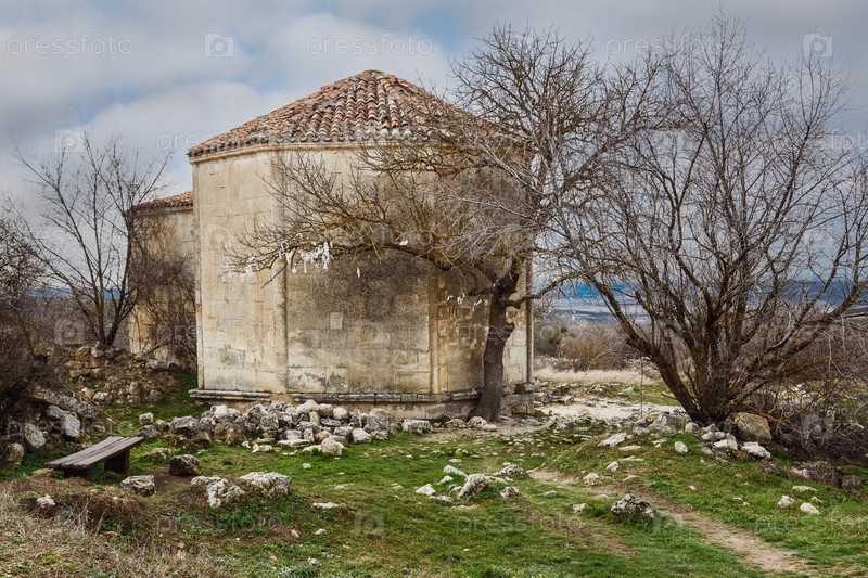 Мавзолей Джанике-Ханым в пещерном городе Чуфут-Кале в Бахчисарае весной, Крым