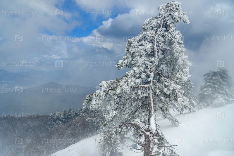 Заснеженная сосна на горе Ай-Петри после метели. Крым