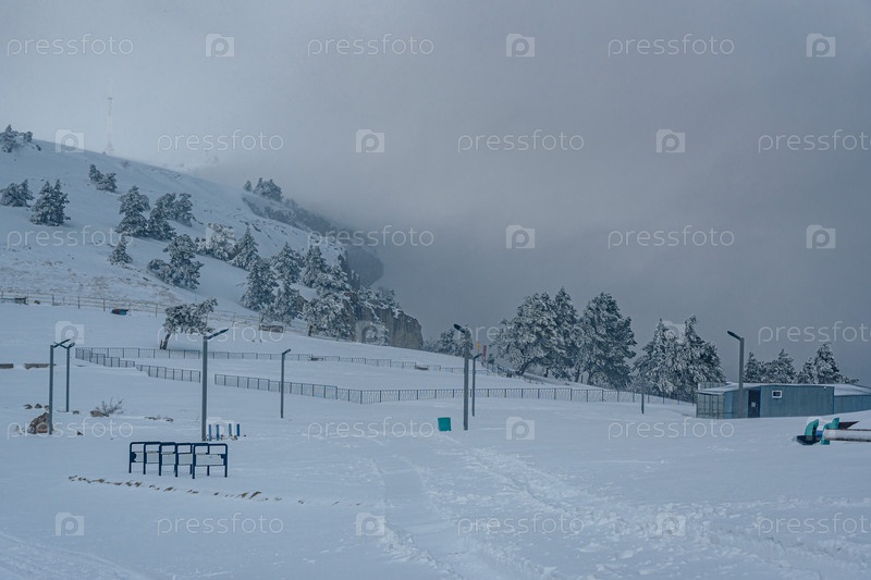 Заснеженный лес на вершине горы Ай-Петри после метели. Крым