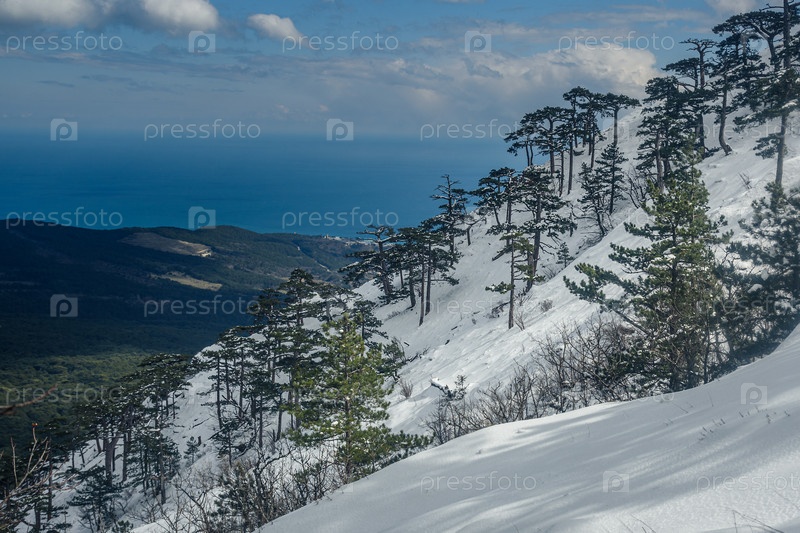 Заснеженный лес на склоне горы Ай-Петри после весенней метели. Крым