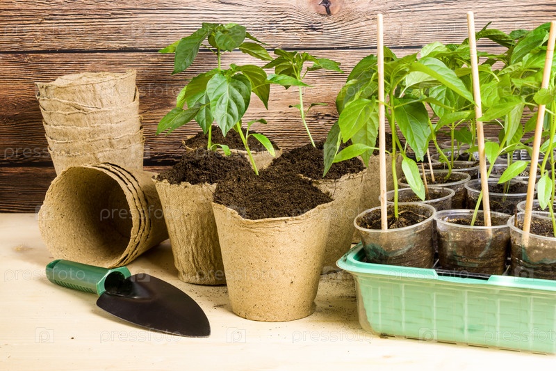 Рассада перца в горшках в торфяных горшочках и пластиковом контейнере. Садоводство весной. Молодые саженцы в горшках
