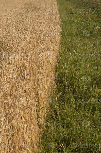 Золотое пшеничное поле заката вечером. Урожай природы роста. Сельскохозяйственная ферма
