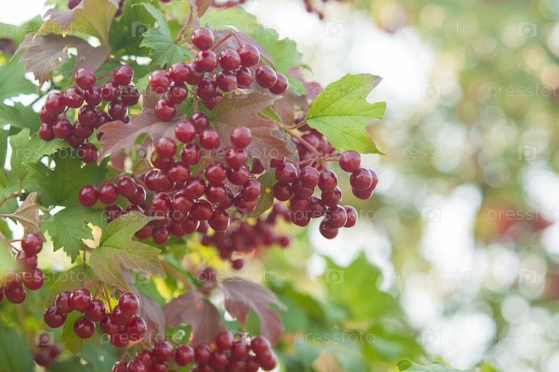 Ягоды и листья калины вибурнум опулус летом на открытом воздухе. Красные ягоды калины на ветке в саду
