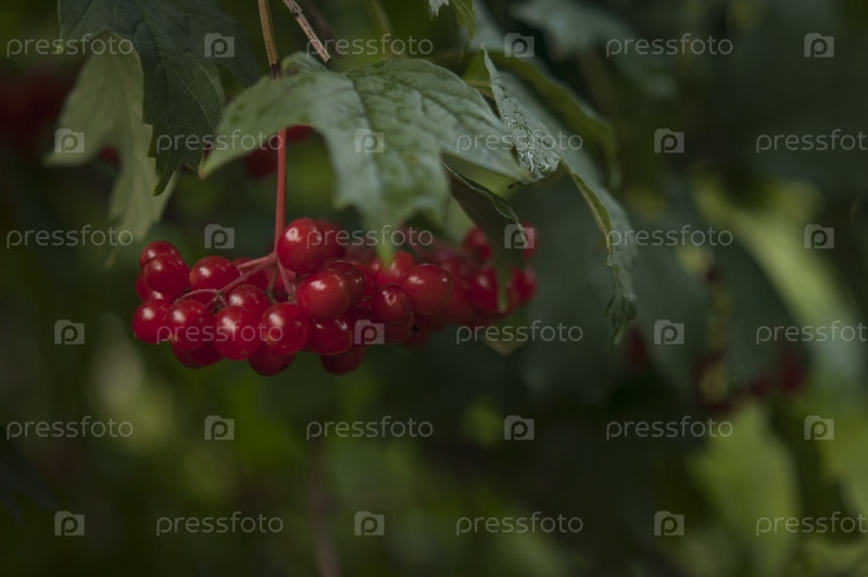 Ягоды и листья калины вибурнум опулус летом на открытом воздухе. Красные ягоды калины на ветке в саду