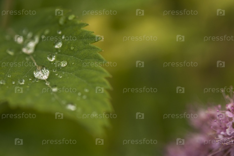 Красивая большая капля утренней росы в природе, выборочный фокус. Капли чистой прозрачной воды на листьях. Весна лето естественный фон