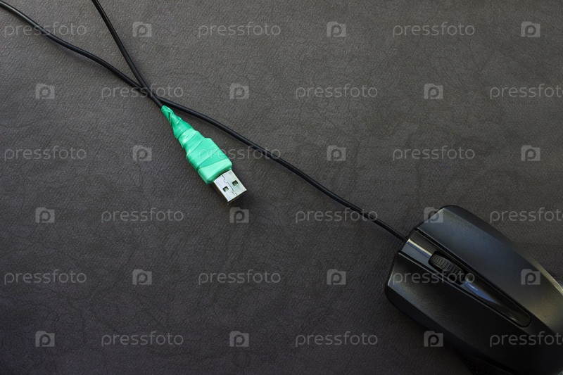Фиксированный кабель USB-мышки, обернутый зеленой изоляцией на черном фоне. Концепция электронных отходов