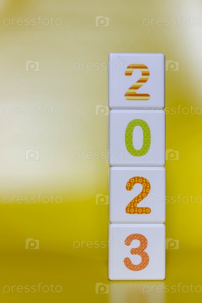 Кубическая башня с красочными цифрами 2023 в центре фото на желтом фоне. Новый год, календарь
