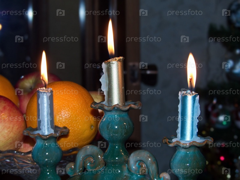 Горящие свечи на подсвечнике в Рождественскую ночь. Праздничная атмосфера. Счастливого Рождества и Нового года!