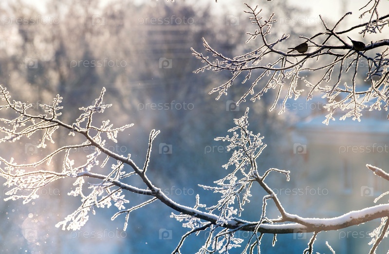 Ветви, покрытые сверкающей весной в холодный солнечный зимний день. Естественный фон