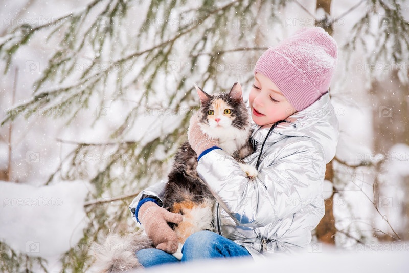 Маленькая девочка сидит с кошкой в объятиях на снегу в зимнем лесу