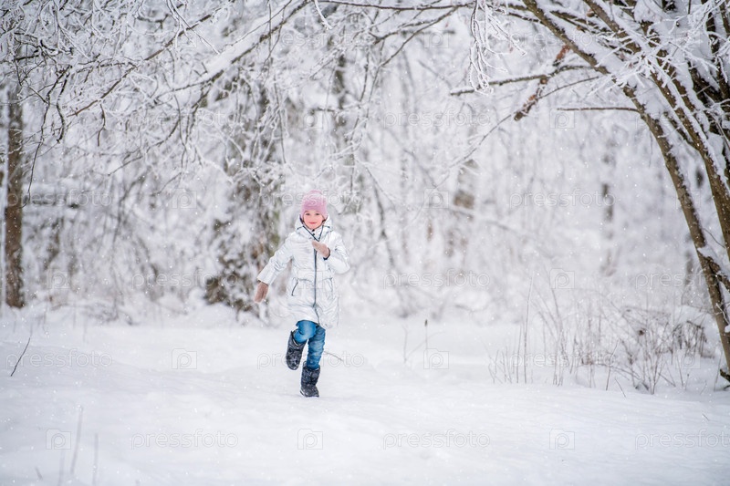 Маленькая девочка бегает зимой в снежном парке