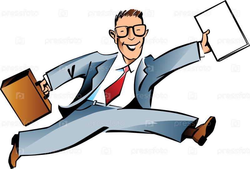 Улыбающийся бизнесмен в строгом деловом костюме и в галстуке бежит с папкой и портфелем в руках, цветной вариант