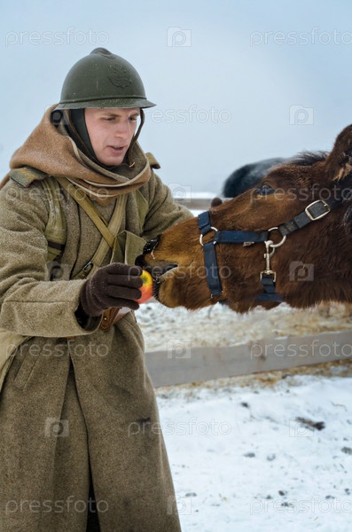 Реконструкция событий Первой мировой войны, русский солдат кормит лошадь. Самарская область 8 января 2016 г