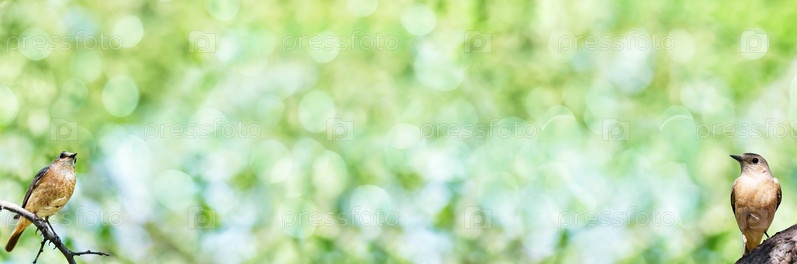 Расплывчатый широкий летний фон с птицами, сидящими на ветвях. Баннер, художественный дизайн