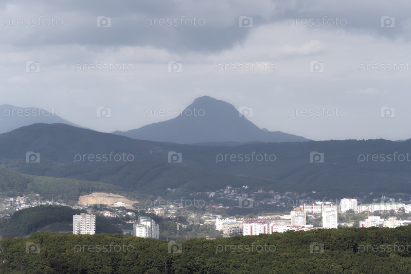 Природный ландшафт с видом на город на фоне гор. Находка, Россия