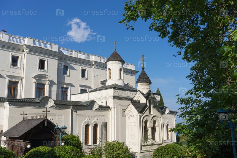 Старое здание замка с белыми стенами на фоне голубого неба и зеленых деревьев