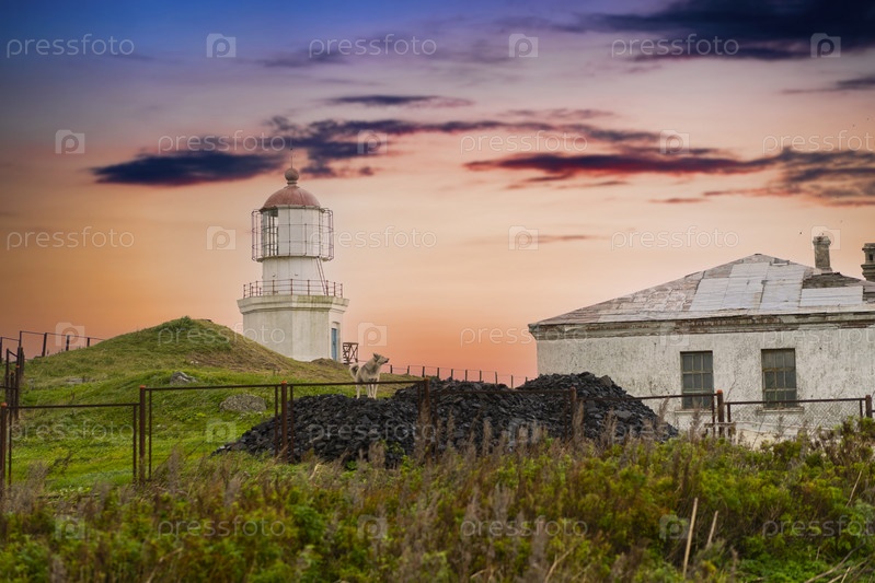 Пейзаж со старым маяком на фоне заката
