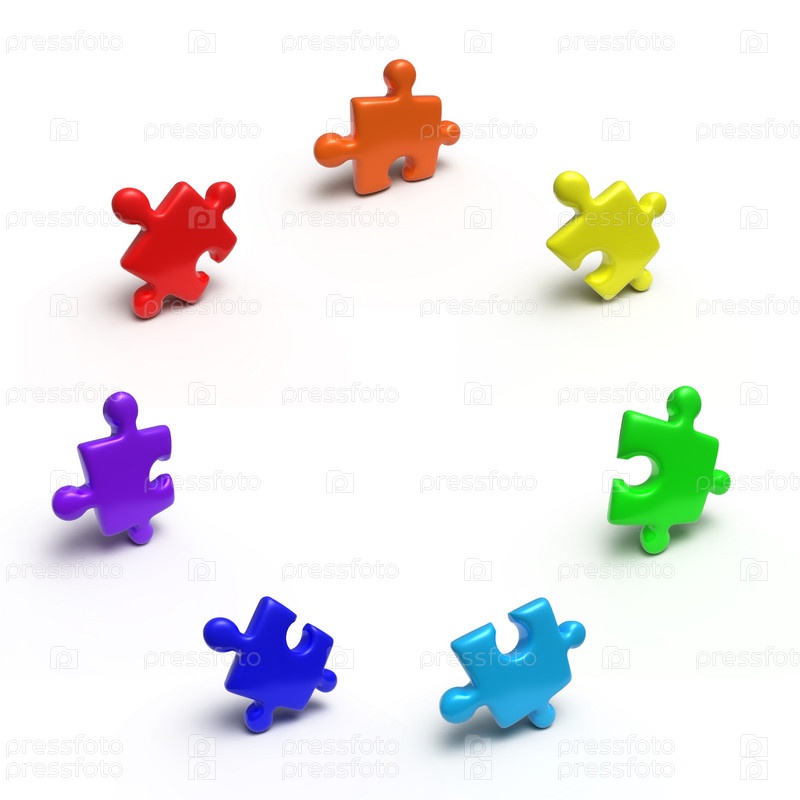 Окружите трехмерную иллюстрацию головоломки цветами радуги. 3D-рендеринг головоломок для логических игр