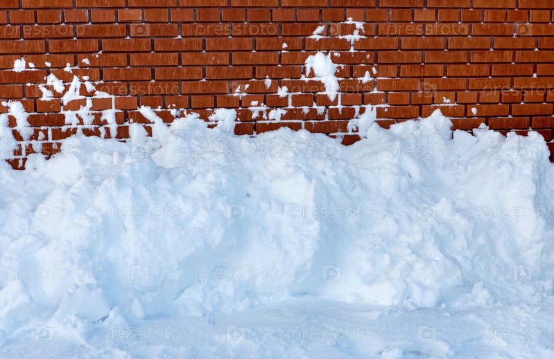 Уборка снега у кирпичной стены