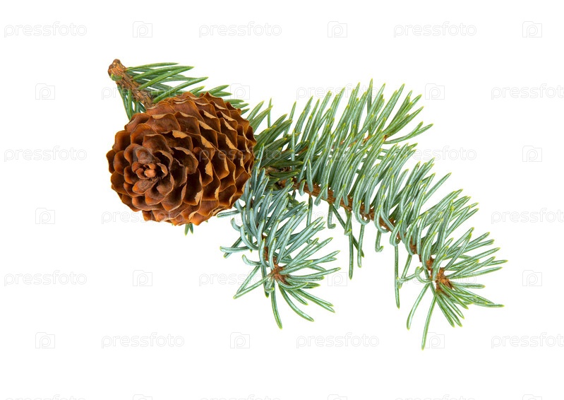 Еловая ветка с шишками, изолированными на белом
