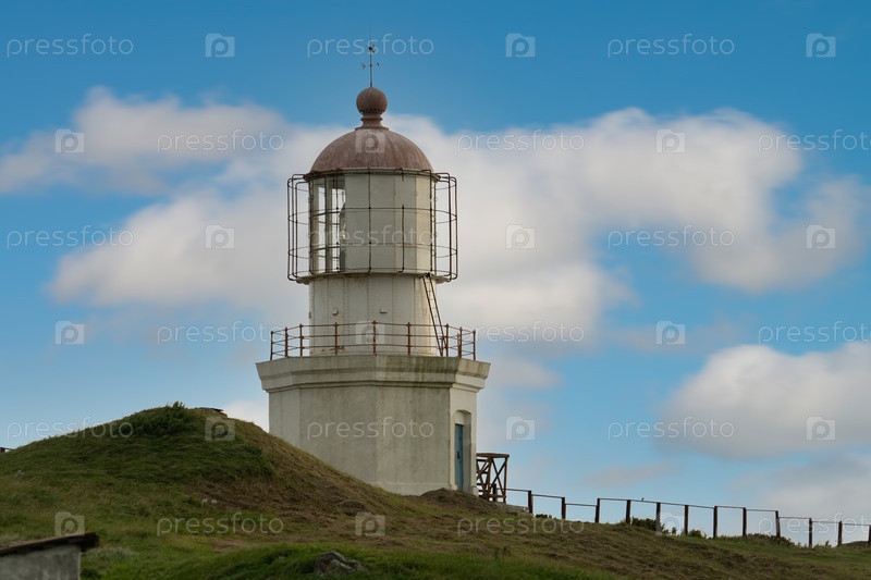 Винтажный маяк на мысе Поспелова на фоне голубого неба