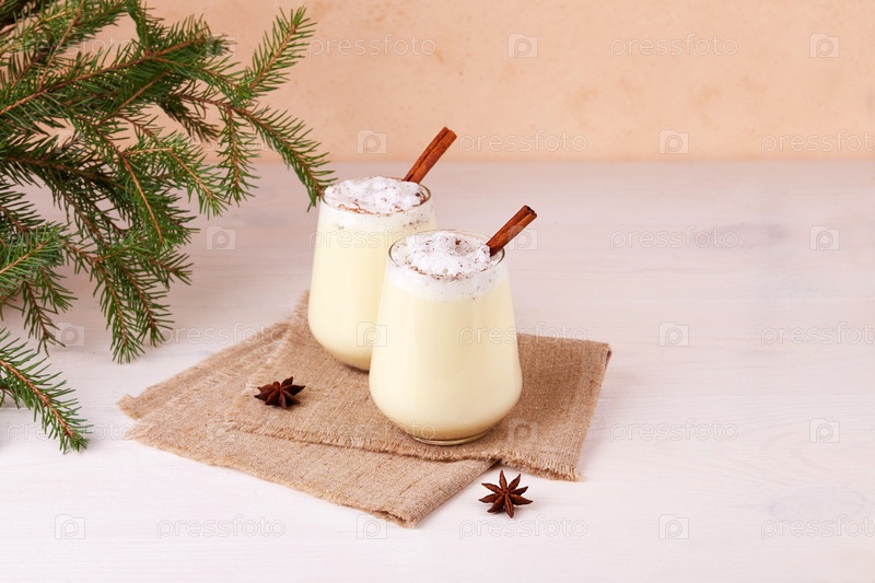 Рождественский напиток Eggnog с измельченным мускатным орехом, взбитыми яйцами, корицей на Рождество и зимние праздники