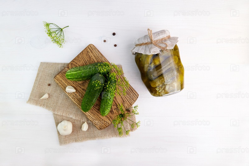 Маринованные огурцы в банке, свежие огурцы, укроп, чеснок
