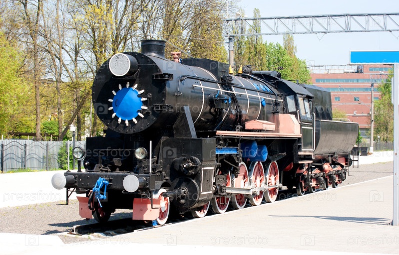 Старый ретро локомотив возле городского железнодорожного вокзала