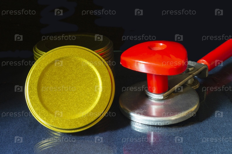 Прокатная машина, крышка банки лежит на столе крупным планом позолоченного цвета