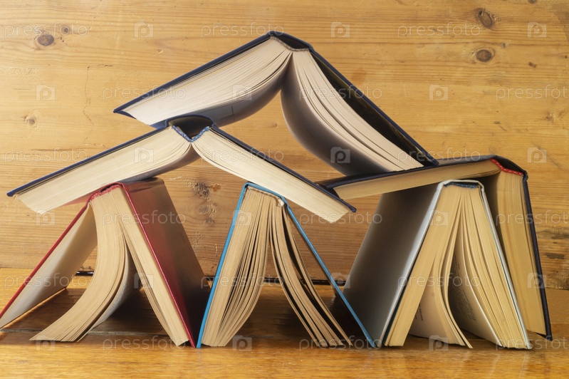 Стопка раскрытых книг опирается на деревянную полку