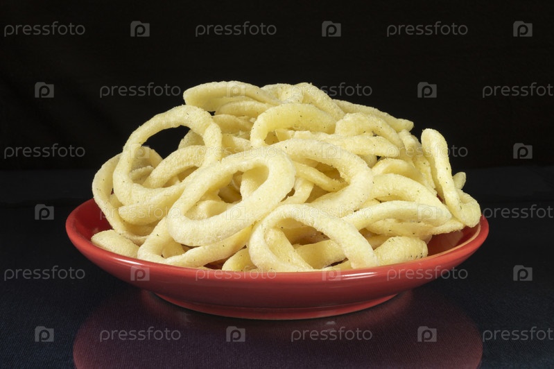 Луковое кольцо картофельных чипсов на стеклянном столе с отражением