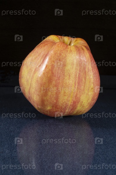 Красное яблоко на синем столе с отражением