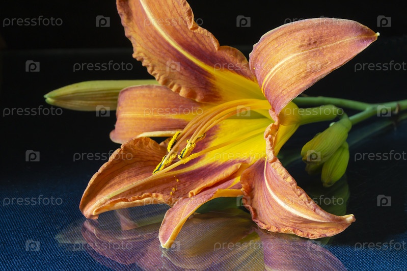 Оранжевая лилия на черном фоне с отражением на столе