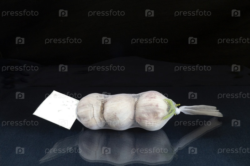 Чеснок в сетке лежит на стеклянном столе с отражением