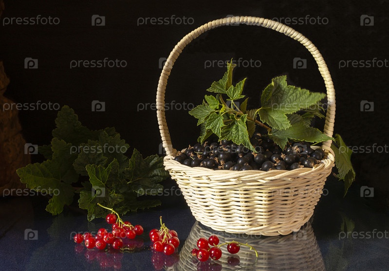Красная и чернеющая смородина с зеленым листом на столе с отражением