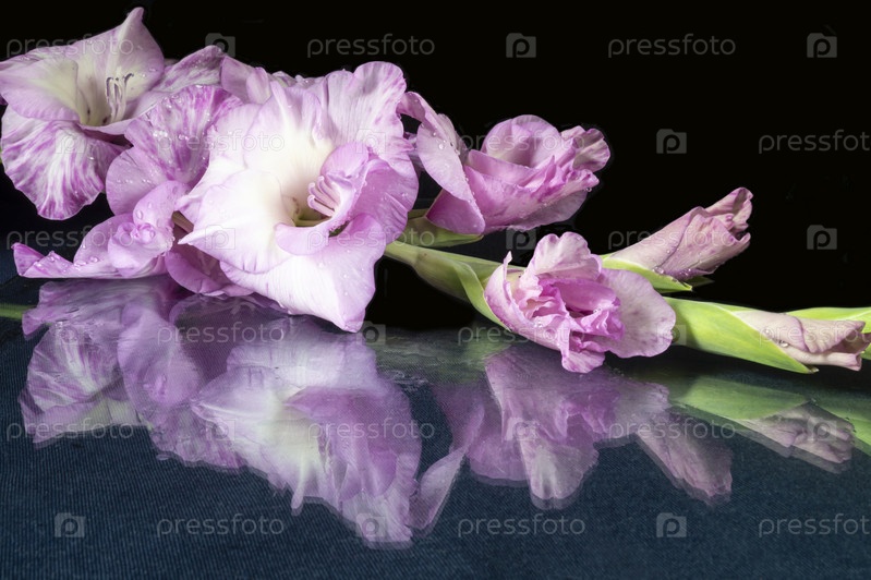 Красивый цветок гладиолуса лежит на столе с отражением