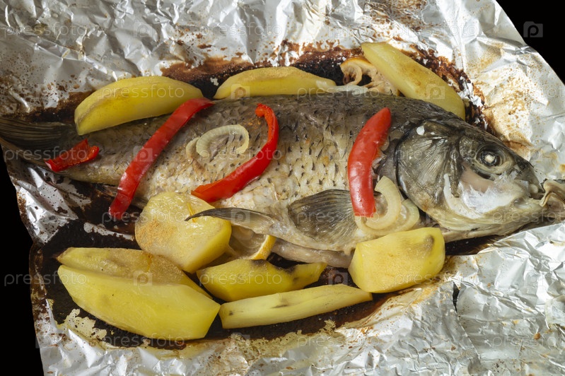 Рыба тушеная с картофелем и красным перцем в фольге