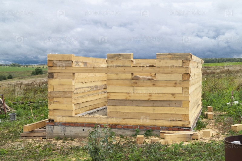 Строительство деревянного здания из бруса на фоне неба