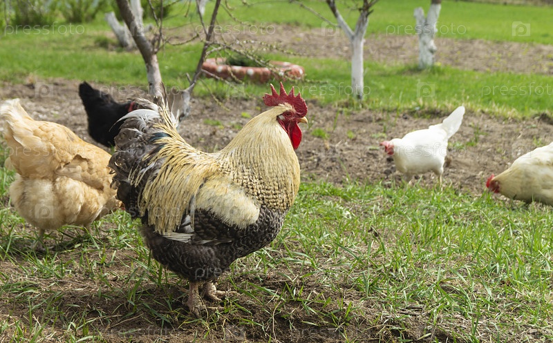 Петух с курицей на фоне зеленой травы