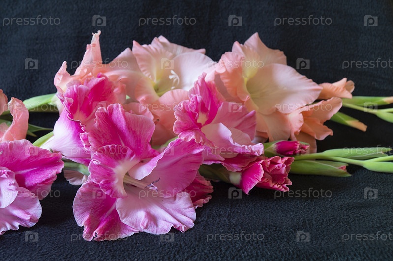 Букет гладиолусов лежит в темноте