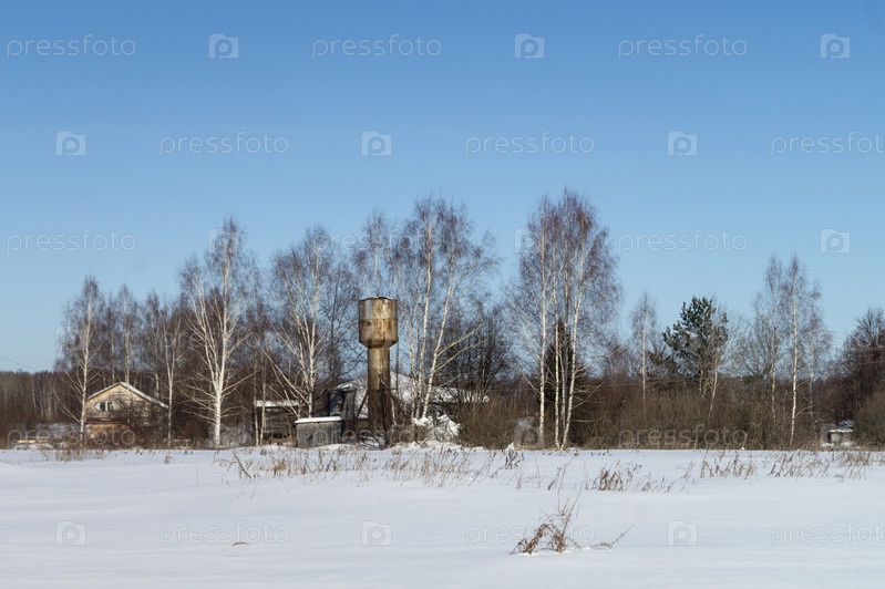 Зимний пейзаж с деревней в березовом лесу