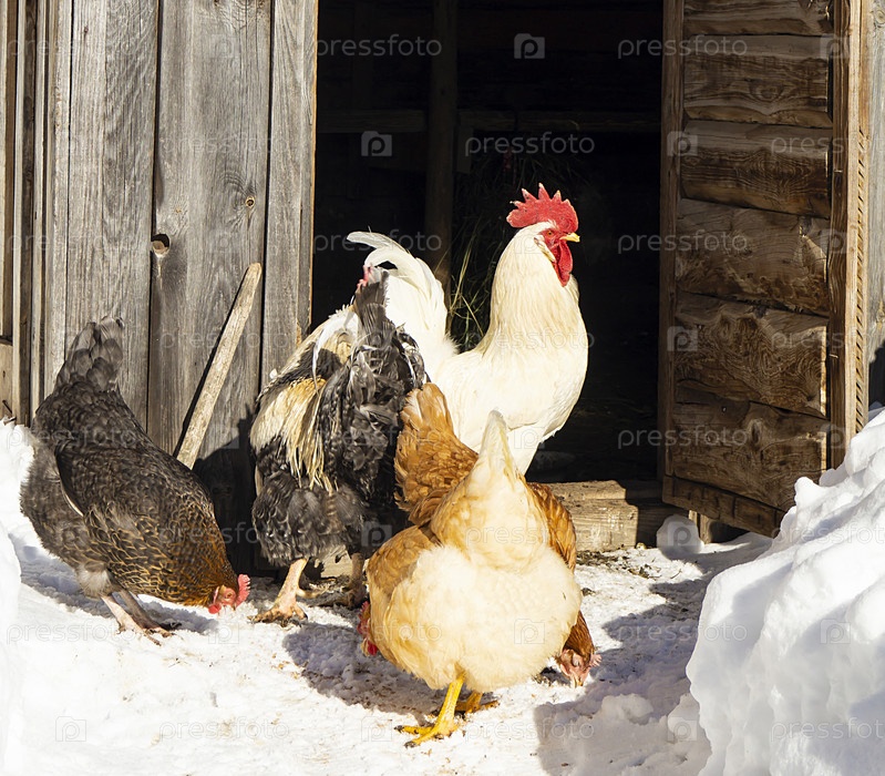 Петух с курицей рядом с курятником на снегу
